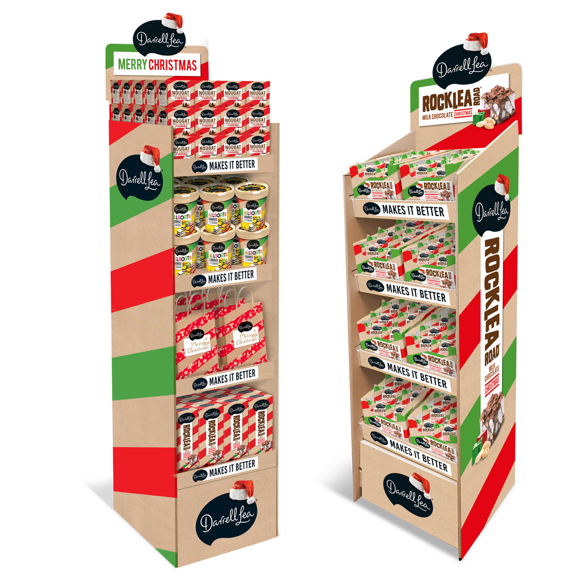 Complimenting the existing ‘stripes’ brand look and feel we created a festive look with custom illustrations, festive colour palette. Display towers with specially designed construction features allowed a greater weight of product to be supported.